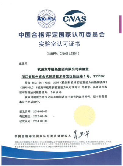 东华链条集团实验室成立于2002年,是专业从事链条产品性能检测及质量分析工作的实验室,2003年5月通过计量认证,对外开展检测和承担政府部门的链条产品质量抽查、检测等任务。为了提高实验室的质量管理水平,同时提高国内外客户对实验室的认知度和可信度。公司于2014年6月份导入ISO/IEC 17025检测和校准实验室能力认可准则,并按要求建立实验室管理体系。2016年7月份通过了国家认可委员会(CNAS)对申请的滚子链、汽车用链条、农业机械链条、输送链、摩托车链、自动扶梯链等不同行业使用的16个产品标准检测能力的现场评审。